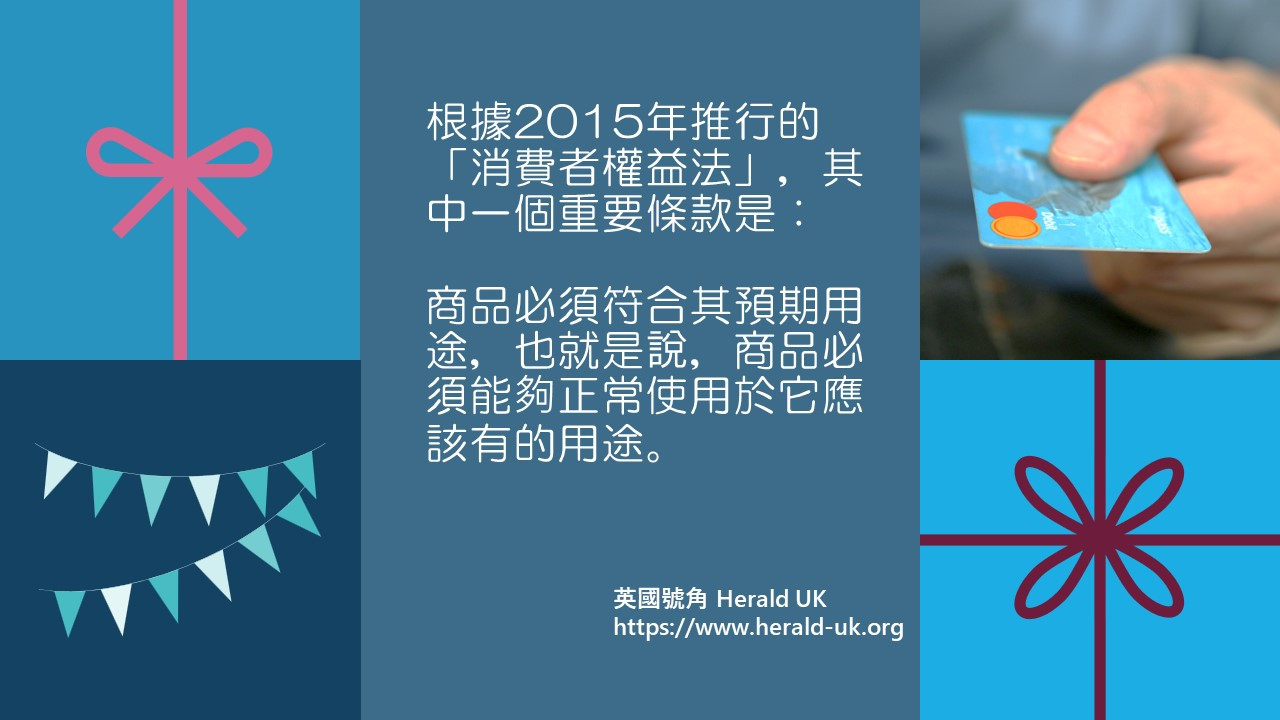 後來,我們決定向當地的消費者顧問(Consumer Advice)尋求協助。他們非常熱心,向我們介紹了2015年推行的「消費者權益法」。根據這項法案,其中一個重要條款是:商品必須符合其預期用途,也就是說,商品必須能夠正常使用於它應該有的用途。因此,花了700多英鎊的一台冰箱,用不到兩年就壞了,顯然是不合理的。