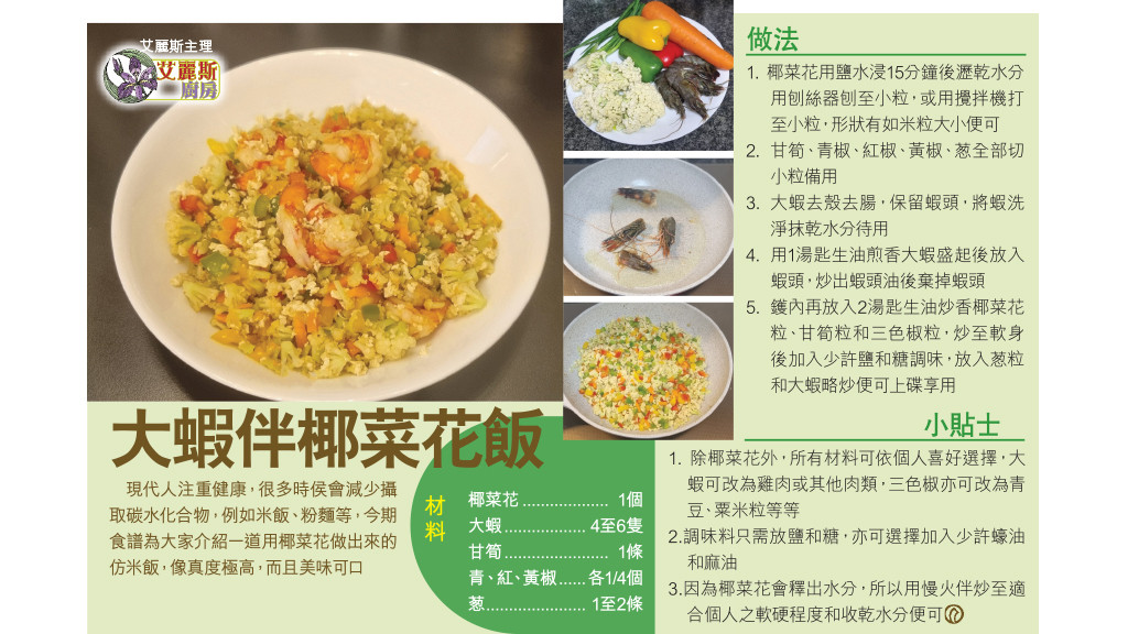 現代人注重健康,很多時侯會減少攝取碳水化合物,例如米飯、粉麵等,今期食譜為大家介紹一道用椰菜花做出來的仿米飯,像真度極高,而且美味可口