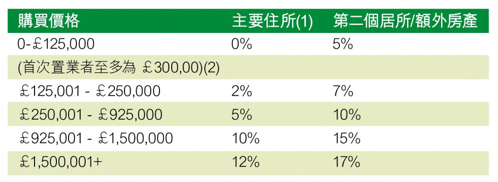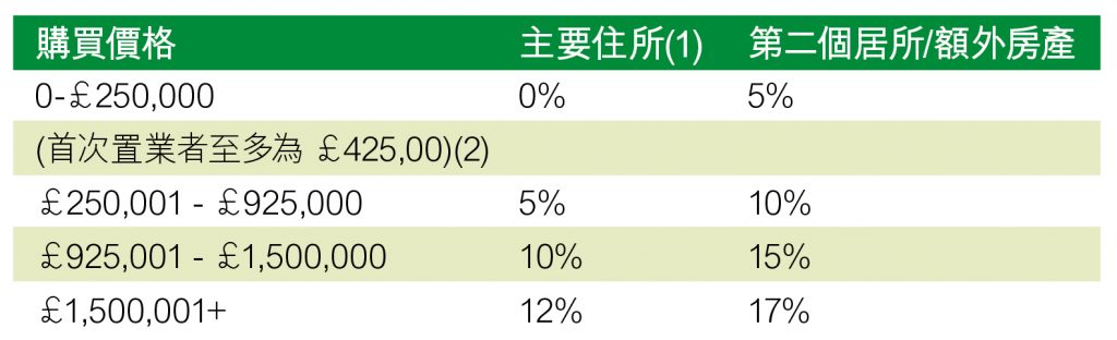 (2) 如果購買的房產價格超過625,000英鎊,則不適用425,000英鎊的首次購房者印花稅免稅額—此時適用250,000英鎊的免稅額。
