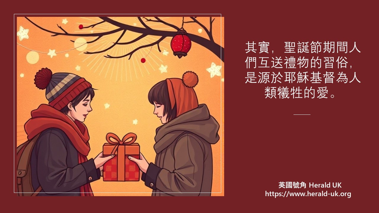 耶穌說:「施比受更為有福。」(《聖經•使徒行傳》二十章35節)。其實,聖誕節期間人們互送禮物的習俗,是源於耶穌基督為人類犧牲的愛,是白白送給我們的,只要我們接受、相信祂,便可以得享永生。你願意接受這份珍貴的禮物嗎?我們感恩之餘,可以學習施予,與別人分享這份愛,成為更多人的祝福。