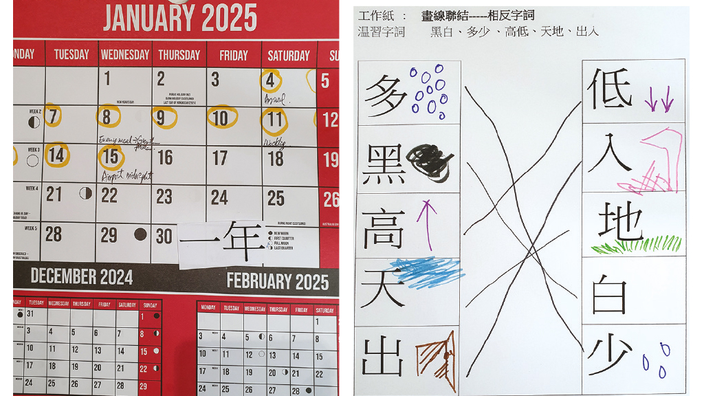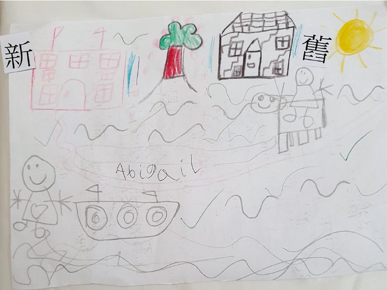 六歲的珩珩是在英國出生,父母皆是以中文為母語,珩珩的中文聽說能力是從家庭日常生活環境習得,雖然珩珩已學習中文一年,她能正確地配對大約100個字及圖片,但她需依賴圖片提示配對字詞,筆者編排她的學習活動多運用她所學的字,其中之一是配對相反詞,例如大與小、長與短、上與下、日與夜、出與入、多與少,她的相反詞學習活動紙上的字詞是沒有圖片提示,但字詞的方格內的位置有空間讓她畫畫,讓她畫出她自己所理解字詞的意義,幼兒在這個階段是非常喜歡畫圖畫,珩珩也是非常喜歡畫圖畫,筆者鼓勵她說出她所畫出圖畫的意思,然後,筆者可以把圖畫的意思使用文字表達,此外,筆者把句子的字詞連結圖畫的意思,例如句子「送舊迎新的一年」的文字剪出,令珩珩更注意每個字詞的意思。若讀者有意了解更多幼兒學習漢字的遊戲方法,歡迎聯絡筆者,使用在Facebook網頁「Tangram Chinese Character Teaching Centre」。
