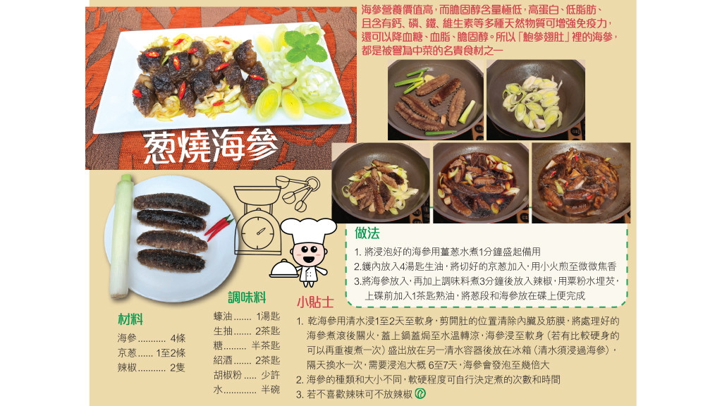 海參營養價值高,而膽固醇含量極低,高蛋白、低脂肪、且含有鈣﹑磷﹑鐵﹑維生素等多種天然物質可增強免疫力,還可以降血糖、血脂、膽固醇。所以「鮑參翅肚」裡的海參,都是被譽為中菜的名貴食材之一