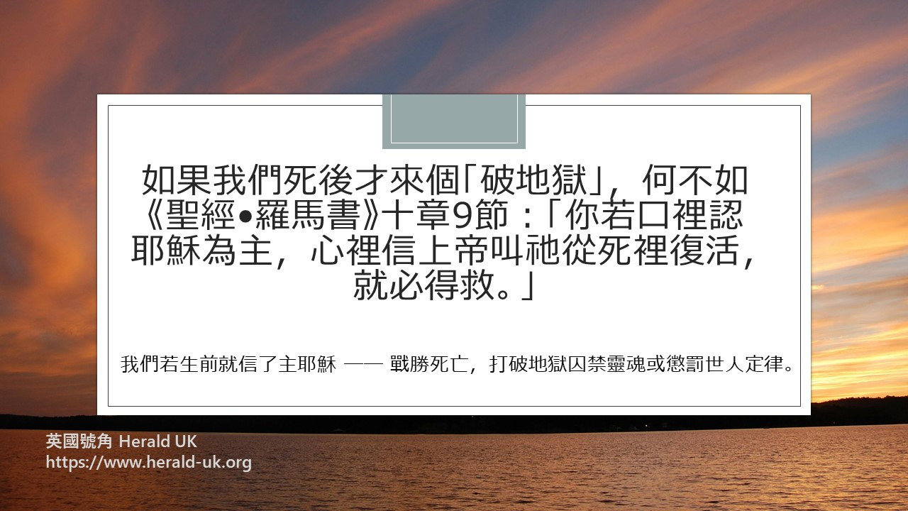 如果我們死後才來個「破地獄」,何不如《聖經•羅馬書》十章9節:「你若口裡認耶穌為主,心裡信上帝叫祂從死裡復活,就必得救。」我們若生前就信了主耶穌──戰勝死亡,打破地獄囚禁靈魂或懲罰世人定律。信靠祂,我們將必去的「陰間」轉為與主耶穌共往樂園,到末日的審判之後,也能跟隨祂升上天堂。