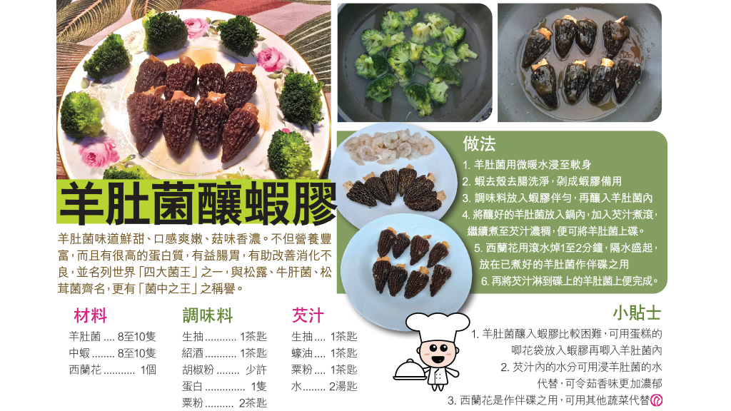 羊肚菌味道鮮甜、口感爽嫩、菇味香濃。不但營養豐富,而且有很高的蛋白質,有益腸胃,有助改善消化不良,並名列世界「四大菌王」之一,與松露、牛肝菌、松茸菌齊名,更有「菌中之王」之稱譽。