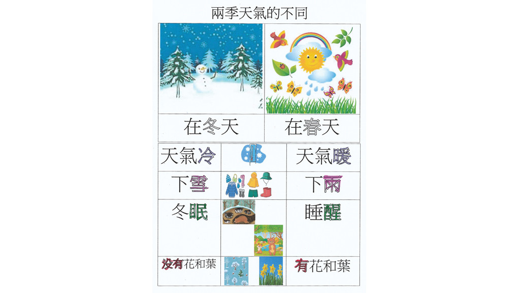 知名的古典音樂家韋發第(Antonio Vivaldi, 1678-1741)創作的《四季》樂曲,旋律優美,香港的線上教學老師嘉芙姐姐創作歌曲《春天》,曲調來自「四季」組曲的《春季》,歌詞「又到春天,大地回暖,可以脫下大件棉襖,小鳥合唱,貓咪高歌,又到春天,花朵再開,鋪滿綠葉,空中飄滿香氣,可愛動物,也醒了過來,這春天,真的很美。」歌詞提到動物在春天睡醒,因為有些動物在冬天時是冬眠;歌詞提到大地回暖,花朵再開,這些語句描述春天景象,相反地冬天天氣寒冷,沒有花朵和綠葉的景象。筆者首先向六歲的珩珩展示冬天和春天的圖片,鼓勵她說出圖片的場景,讓珩珩多運用她所懂得的語句,筆者讓珩珩配對冬天和春天的詞語:冬天是冷、下雪、冬眠、沒有花朵和綠葉;春天是暖、下雨、睡醒、有花朵和綠葉。排列相反詞語的學習活動,有助學生連繫記憶每個字詞的意思。