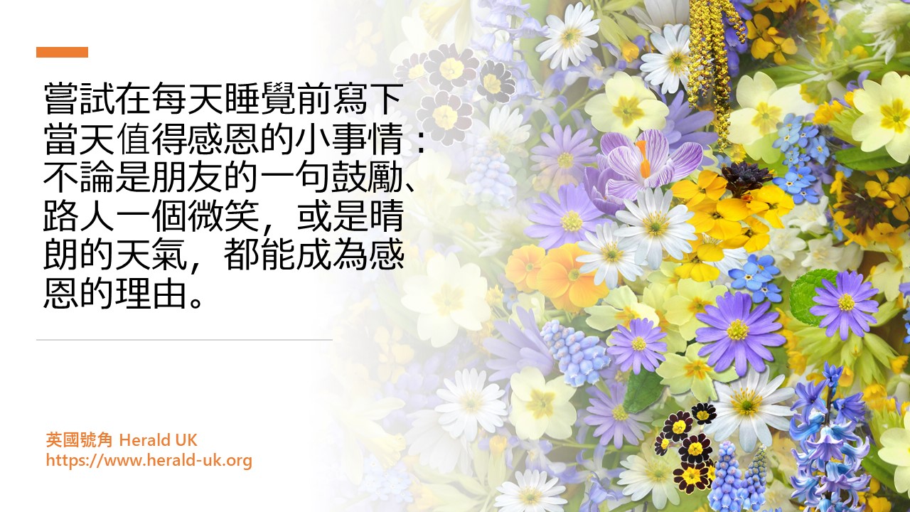 感恩是一種生活態度,也是一種心靈的操練,讓我們的心境更平和與喜樂。《聖經•箴言》十七章22節指出:「喜樂的心乃是良藥;憂傷的靈使骨枯乾。」從今天開始,讓我們一起培養感恩的心,讓春天的再生盼望充滿心靈!