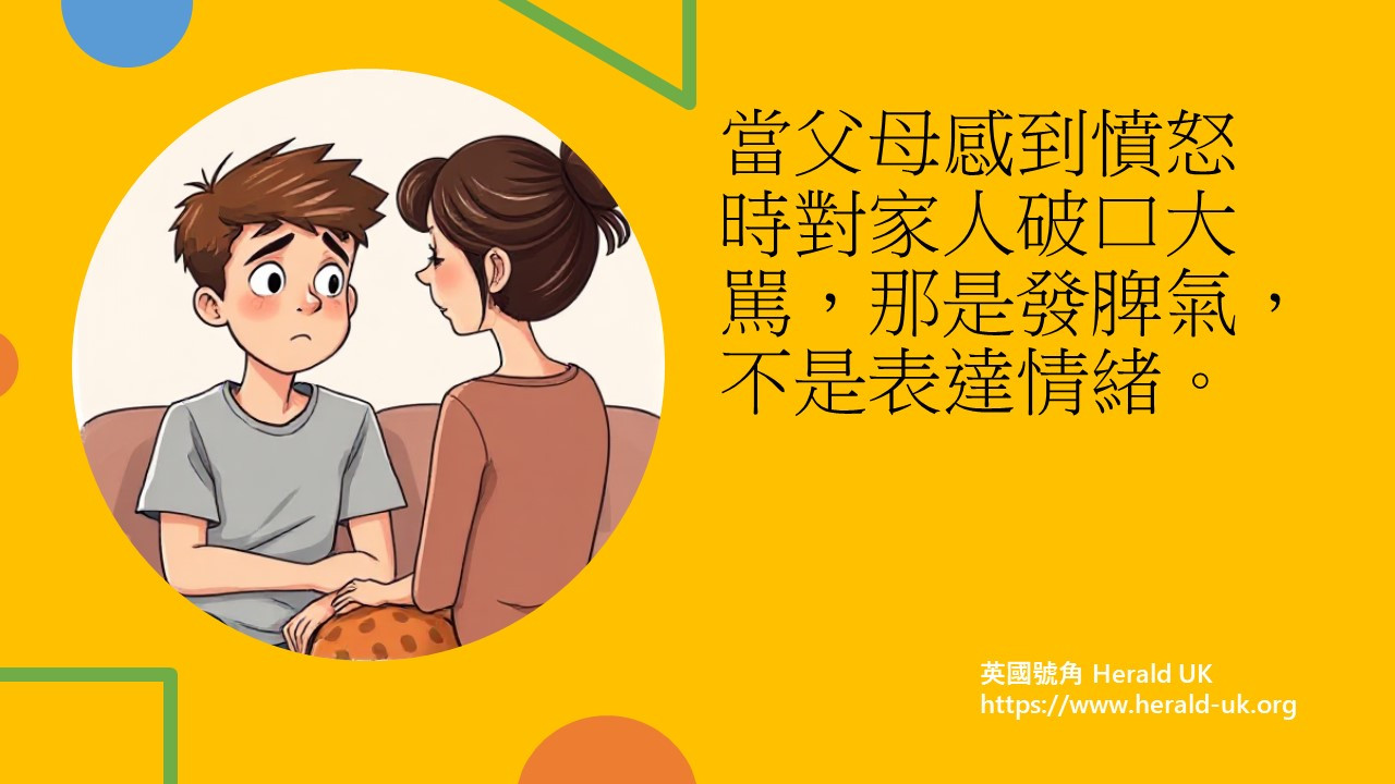 你是否了解你自己的情緒,你會否習慣向伴侶及子女表達你的情緒?這不是說當父母感到憤怒時,就可對家人破口大駡。那是發脾氣,不是表達情緒!認知及表達情緒是要將事件及情緒結連關係如「我覺得很氣憤,因為我見到/聽到/遇到……」,以適當語氣、表情、肢體動作告訴孩子你當刻的情緒及引發情緒的事件。這不是說感到憤怒時,就可大聲地向孩子說話,甚至作狀出手或真的出手打孩子。感到憤怒時,可以是以肯定的語氣和孩子解釋憤怒的原因。