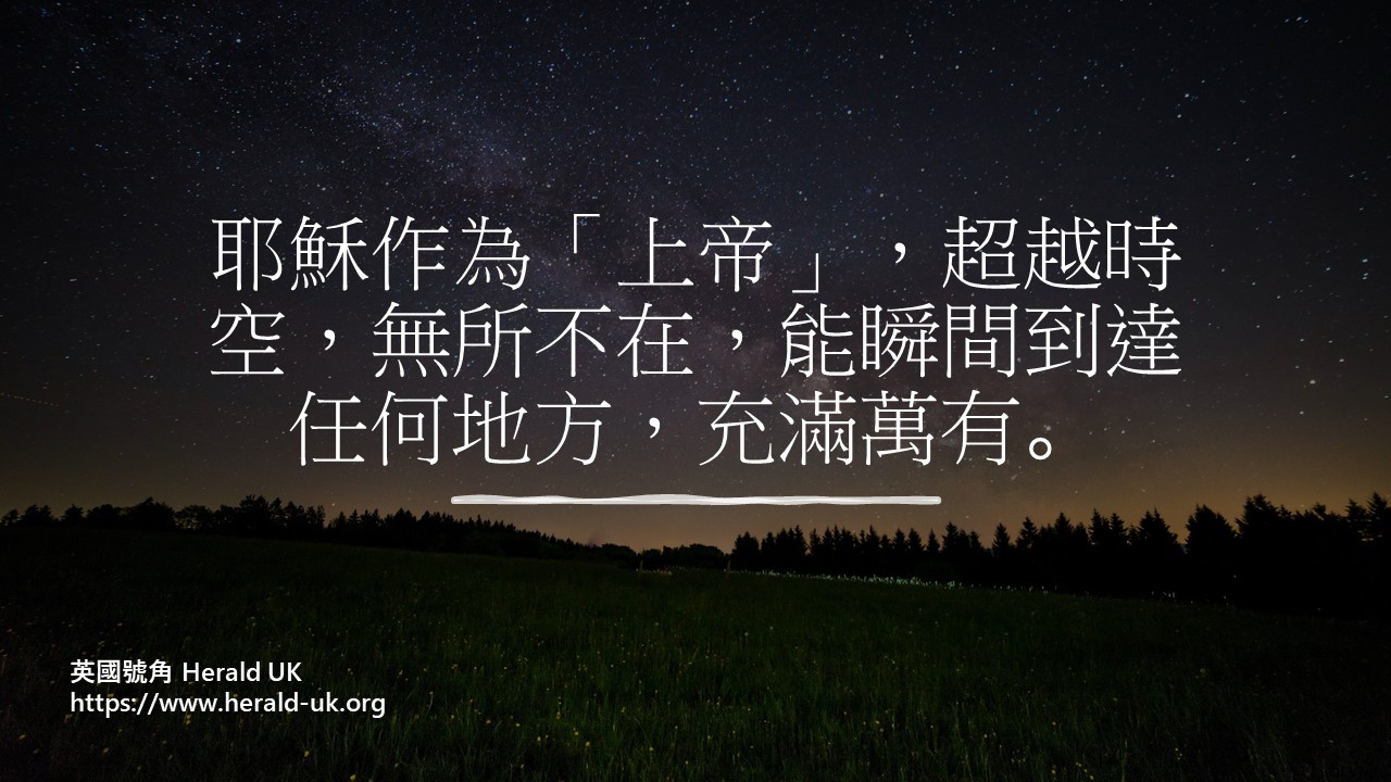 耶穌作為「上帝」,超越時空,無所不在,能瞬間到達任何地方,充滿萬有:「因為人子在祂降臨的日子,好像閃電從天這邊一閃直照到天那邊。」(《路加福音》十七章24節)祂永遠活着,從不改變:「耶穌基督昨日、今日、一直到永遠,是一樣的。」(《希伯來書》十三章8節)
