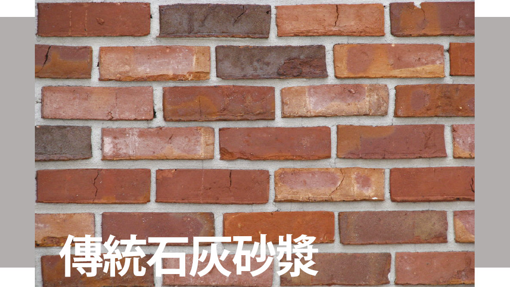 - 摻合砂漿(Gauged Mortar)──在傳統石灰砂漿中加入少量水泥(通常不超過10%),可加快凝固速度並提高強度,介於純石灰砂漿與現代水泥砂漿之間,適合用於某些需要較高強度但仍保留部分透氣性的建築項目。