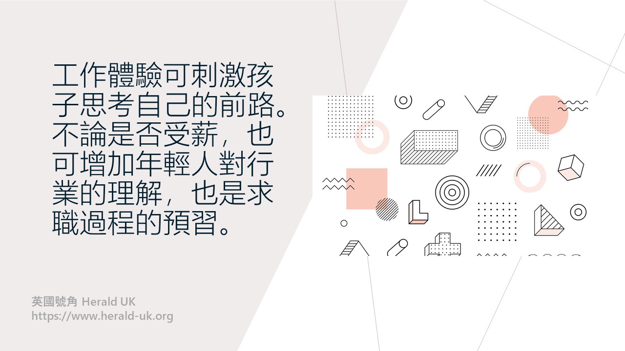 同時,孩子是否了解自己的志向及能力也是重要,除了一些職業志向測試外,工作體驗也可刺激孩子思考自己的前路。很多時家長以為工作體驗是為滿足英國大學報讀醫科或獸醫的收生要求,這項要求不是為儲時數,而是更着重增加年輕人對行業的理解及反思自己是否適合投身該行業。選擇學徒課程和選擇報讀醫生、獸醫一樣,也是一個長期的投資,是要年輕人下最大的決心投身一個行業。找工作體驗,不論是否受薪,也可增加年輕人對行業的理解,也是求職過程的預習。暑假將至,家長可鼓勵子女踏出這一步,為自己計劃一下未來。