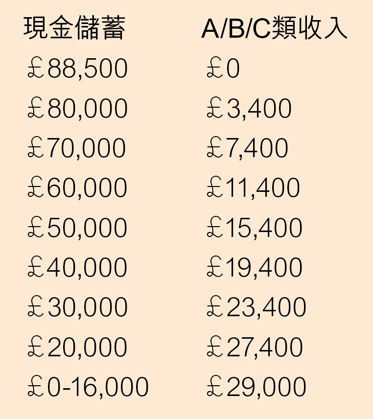 換句話說如果能夠證明擔保人及/或申請人,在提交申請前的過往六個月擁有£88,500的現金儲蓄,那理論上是完全不需要提出任何薪金收入證明。另一方面如果只擁有£16,000現金,那就需要證明有全額,即每年£29,000的收入才能夠滿足財務要求。現金儲蓄的設有£16,000的下限是因為這以下就可以申請與收入有關的社會福利。