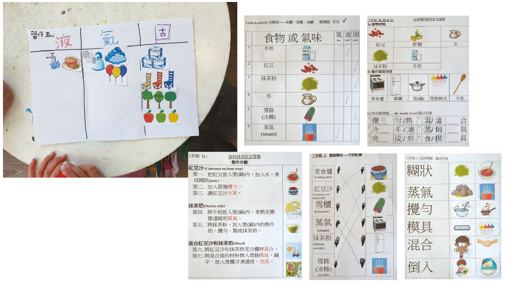 《十萬個為什麼》是一套非常著名的書,目的是向天生具有好奇心與探索能力的兒童及青少年介紹生活科學知識,對幼兒是否可以推行科學遊戲的活動課程?幼兒是否有能力理解簡單的科學概念?事實上,幼兒天生是小小科學家,根據幼兒智能發展,四至五歲的幼兒開始透過日常生活中的觀察、感官體驗和成年人指導,幼兒可以理解科學架構,例如物質的三種狀態(固態、液態和氣態)。冰棒是幼兒最喜歡其中之一種的食物,製作冰棒過程是從液體變化成固體。炎熱的夏天快將來臨,將幼兒最喜歡的食物成為學習的主題活動,透過日常生活情景,能促進幼兒運用學習漢字詞語──課堂內容的對象年齡是四至七歲,學習目標的字彙是有關廚房用具及物質的三態變化:第一張工作紙是引入活動,向幼兒展示日常生活的物品或情景的字和圖片,例如水的三種狀態,讓幼兒察覺日常生活所看見的冰及水蒸氣皆是水的不同形態,工作紙內容是辨別圖片的物品屬於三態的哪一種狀態;第二張工作紙以大約五至六十字描述做冰棒所需要的廚房用品和步驟,目的是培養幼兒聆聽老師讀出上文下理,內容是有文字配上圖畫,讓幼兒吸收學習內容的背景資料;第三張工作紙詞語配圖,增加幼兒認讀生字的信心;第四張工作紙詞語配上二選一的圖畫,幼兒需要配上圖畫作提示,增加幼兒學習漢字的成功感;第五張工作紙是剪貼手工圖畫,將物品的三態分類,有助幼兒記憶課堂的內容。