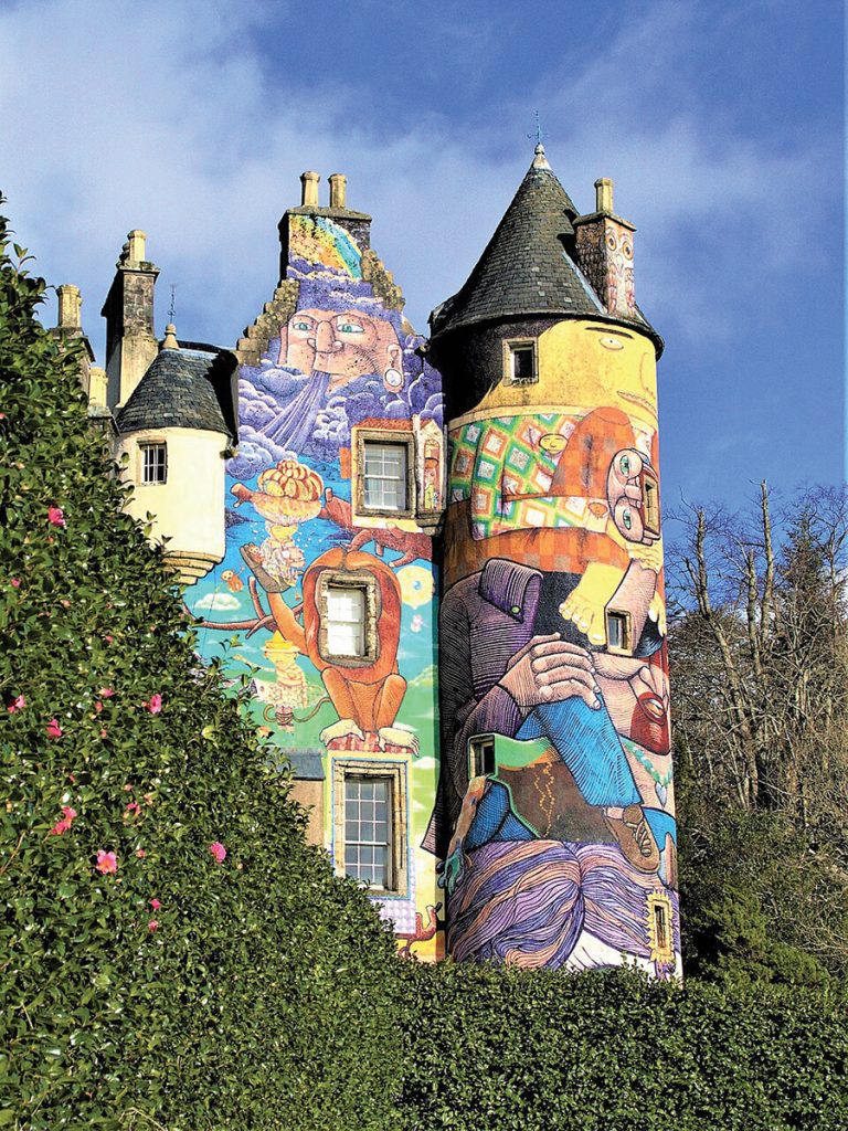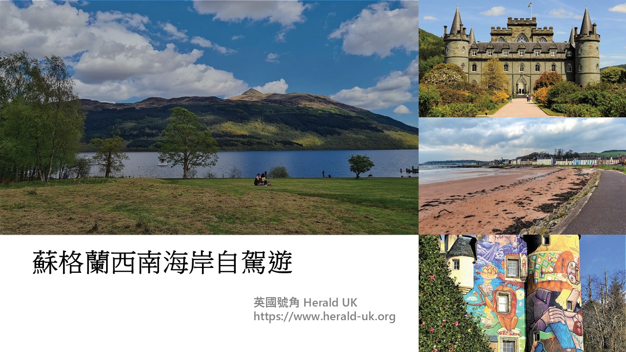 第二天出發沿A83南下接A815,於Hunters Quay搭乘人車渡輪橫渡克萊德河(River Clyde)前往海邊小鎮Largs。這段路線風景多變,欣賞山林與海岸線交替的美景。在Largs之前,可前往附近Kelburn Castle and Estate參觀被現代街頭藝術覆蓋的彩色古堡,其森林步道也充滿了神秘氣息。