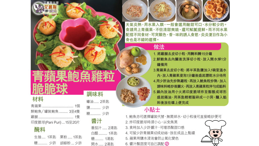 天氣炎熱,用水果入饌,一般會選用酸甜可口、水分較少的。食譜用上青蘋果,不但清甜爽脆、還可解膩提鮮。而不同水果配搭不同食材,可突顯色、香、味的誘人食慾,炎炎夏日作為小食也是不錯的選擇。