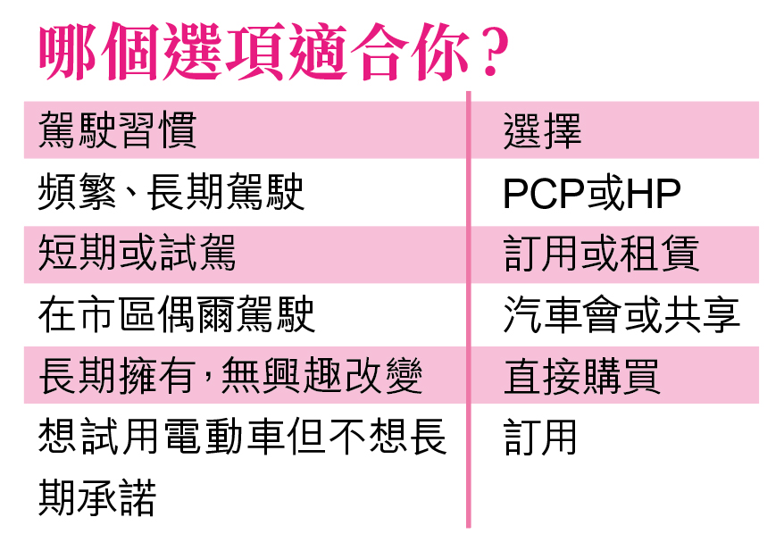 缺點──每月費用比租賃或PCP更高;與購買或租賃相比,車輛選擇有限;通常在城市使用。
