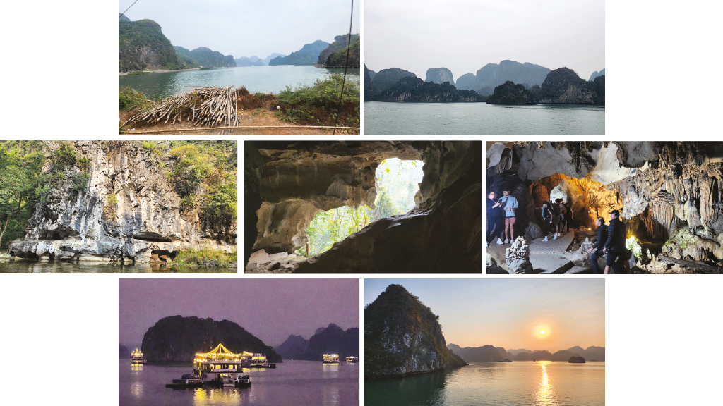 從河內開車兩小時便能踏上著名的下龍灣觀光輪。啟程不久,壯麗的湖景與奇特的石灰岩山巒便浩浩蕩蕩地捲入眼簾。若要近距離接觸山石的話,可借用獨本舟來遊灣。日落時分,斜陽映照水面,島嶼在霞光下勾勒出濛濛的輪廓,不少乘客便到甲板上感受這一刻的詩意。夜色降臨,靜謐的海面閃爍點點磷光,彷彿與滿天星斗對話。三代人並肩坐在甲板上,欣賞這場大自然的盛宴,頓覺無聲勝有聲。