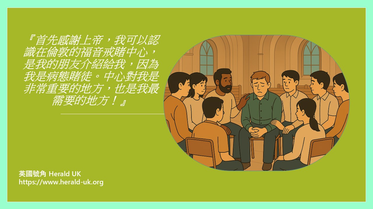 「首先感謝上帝,我可以認識在倫敦的福音戒賭中心,是我的朋友介紹給我,因為我是病態賭徒。中心對我是非常重要的地方,也是我最需要的地方!因為我得到正確幫助和支援,使我身體、心靈和情緒都得到改善,同人相處和同上帝的關係也大大改善!在中心有弟兄姊妹支持,同行守望,一同禱告。逢星期一又有查經班大家一起學習上帝的話語,也是對抗賭癮的最好醫治!我衷心多謝中心的同工、輔導員和義工的辛苦付出代價,幫我走出賭徒的生活,做個好的基督門徒,再次多謝福音戒賭中心,更希望我也可以在中心做義工,去服務和幫助有需要的人。」