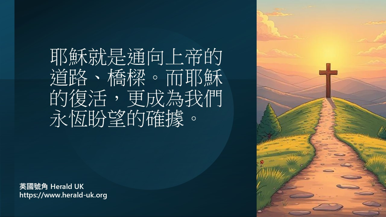 《聖經》記載,耶穌在十字架上斷氣的一剎那,聖殿內的幔子從上而下裂開,象徵祂的死開闢了一條直接通往上帝的新道路,不再需要祭司或特定的儀式,而是所有信祂的人都可以坦然無懼地來到上帝面前,直接與祂對話。在耶穌成就救恩之前,猶太人要靠大祭司這個第三者,一年一次進入至聖所向上帝獻祭。但耶穌用自己的身體為祭,一次獻上,為所有人贖罪。我們因此不再需要獻祭,也不再需要第三者的介入。耶穌就是通向上帝的道路、橋樑。而耶穌的復活,更成為我們永恆盼望的確據。這使我們深知,自己已與上帝和好,不再被罪和律法所隔絕。 因為耶穌,就是真理、道路、生命。