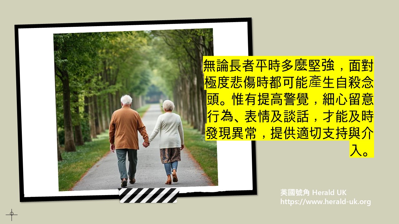 最後提醒,無論長者平時多麼堅強,面對極度悲傷時都可能產生自殺念頭。惟有提高警覺,細心留意行為、表情及談話,才能及時發現異常,提供適切支持與介入。